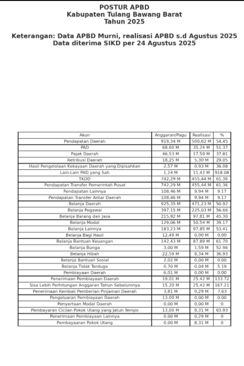 Terserap 471, 23 Miliar, Realisasi APBD Kabupaten Tulang Bawang Barat Capai 50,92 Persen Hingga Agustus 2025