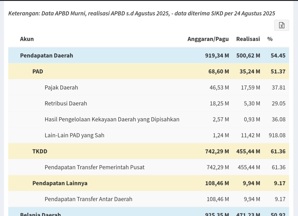 Data ini bersumber dari laporan resmi DJPK Kemenkeu RI melalui Sistem Informasi Keuangan Daerah (SIKD), yang diterima pada 24 Agustus 2025. (Baz)